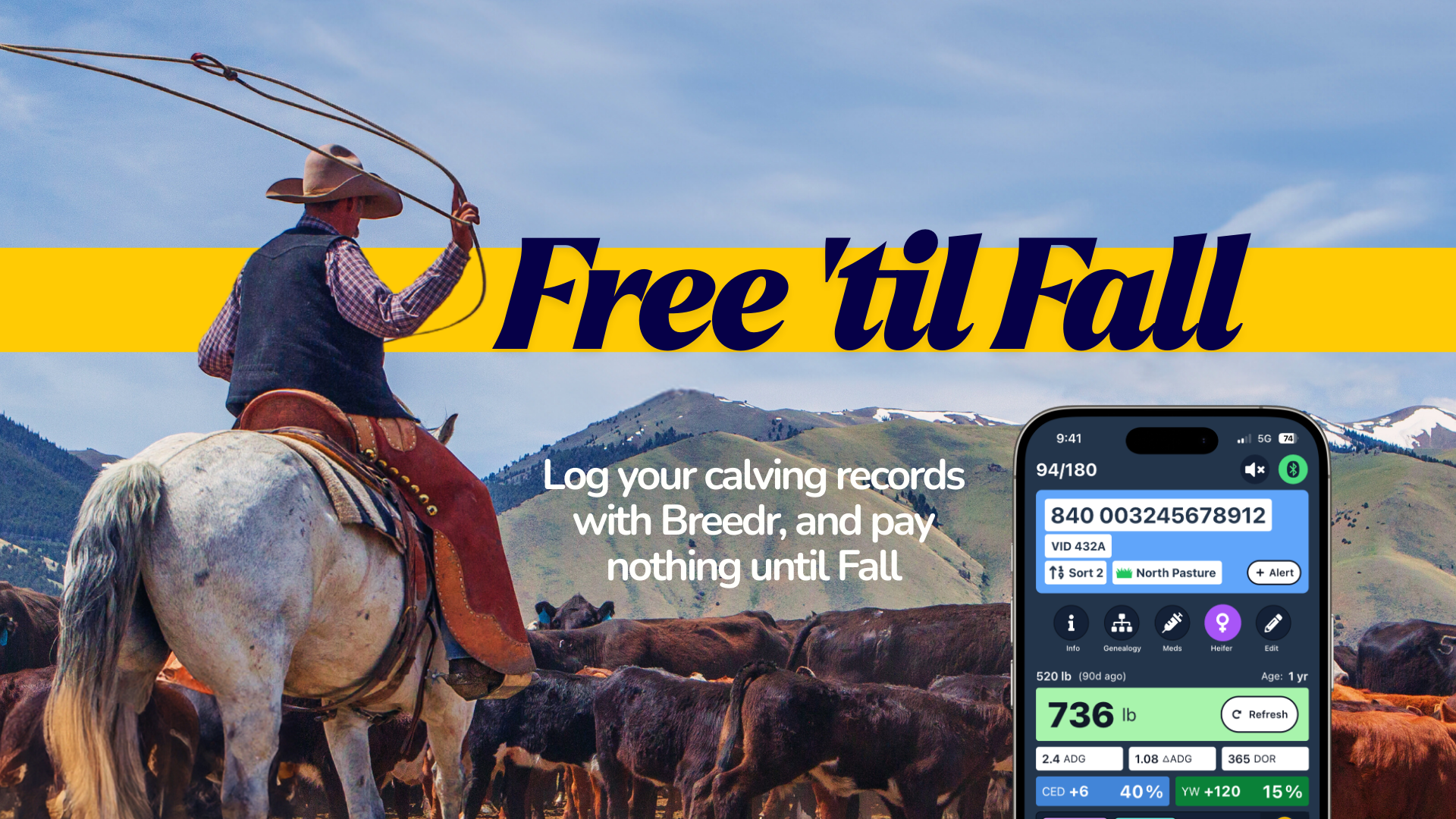TERMS & CONDITIONS: Free ‘til Fall offer gives you 8 months free access from the date you join, after which you will continue to be charged at the standard subscription rate. This offer is only available to new customers who sign-up for a Breedr Basic or Breedr Premium account on or before April 30th 2026. Maximum number of cattle is 1500. Offer excludes any optional onboarding, or implementation fees, which may be required depending on the complexity of your operation. Free trial members can cancel anytime before the renewal date by emailing supportusa@breedr.co